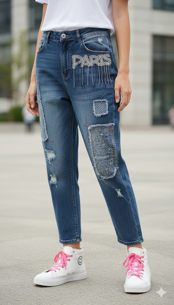 Diese exklusive Jeans in klassischem Blau ist ein echtes Kunstwerk für dein Outfit. Die Front besticht durch aufwendige Jeans-Flicken im modischen Paisley-Muster, die der Hose einen individuellen Vintage-Charakter verleihen. Edle „Paris“-Applikationen, kombiniert mit feinen Ketten-Details und funkelnden Strasssteinen, setzen luxuriöse Akzente. Auch die Rückseite überzeugt durch eine kunstvoll gepatchte Tasche, die das Design perfekt abrundet.