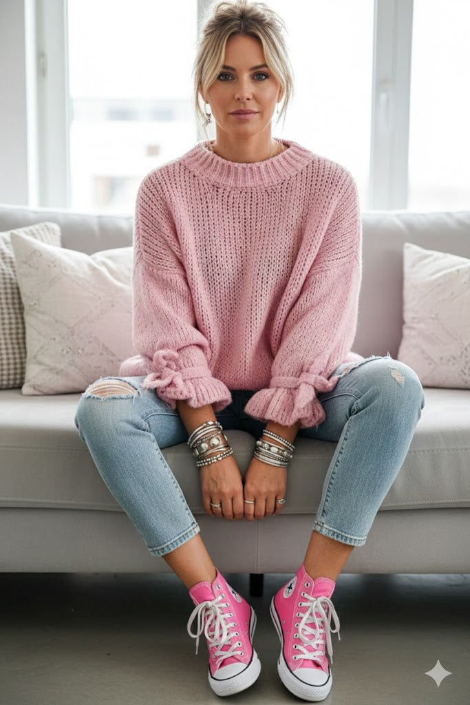 Ein eleganter Oversize-Strickpulli mit gerüschten Tulpenärmeln und zarten Schleifenbändern an den Armen in 3/4 Länge. Das verspielte Design kombiniert feminine Details mit einem bequemen Schnitt – perfekt für stilbewusste Frauen, die Komfort und Raffinesse lieben.