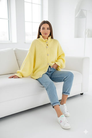 💛 Oversize-Cardigan in Gelb mit Tulpenkragen – tragbar von Größe 36 bis 50