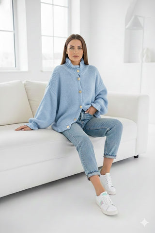 💙 Oversize-Cardigan in Hellblau mit Tulpenkragen – tragbar von Größe 36 bis 50