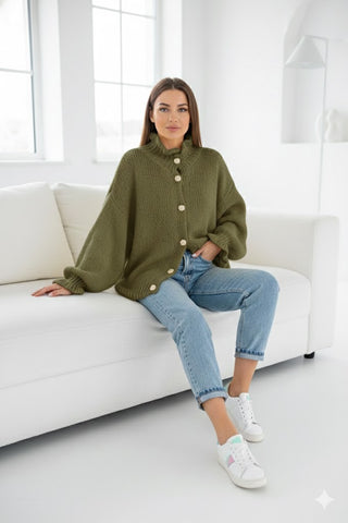 🫒 Oversize-Cardigan in Olivgrün mit Tulpenkragen – tragbar von Größe 36 bis 50