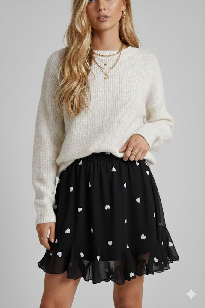 Dieser feminine Rock mit locker fallenden Stufen und doppellagigem Design besticht durch sein zeitloses Herzchen-Muster in Weiß auf klassischem Schwarz. Das weiche Material sorgt für ein besonders angenehmes Tragegefühl und lässt sich wunderbar vielseitig kombinieren. Dank des elastischen Bundes bietet der Rock maximale Flexibilität und eine bequeme Passform für jede Gelegenheit. Ob schick kombiniert oder als verspielter Akzent im Lagenlook – dieser Rock ist ein absolutes Must-have für feminine Styles.