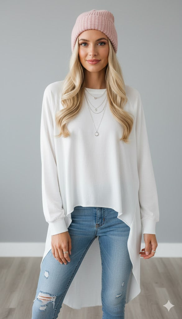 • Stil: Lässiges Langarm-Longshirt im Vokuhila-Schnitt.