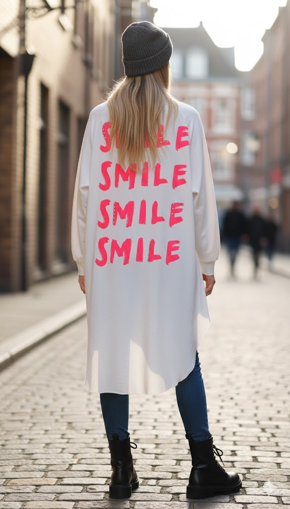 Dieses stylische Longshirt in strahlendem Weiß ist ein absoluter Blickfang mit Gute-Laune-Garantie. Das modische Highlight befindet sich auf der Rückseite: Ein auffälliger Smiley-Print in leuchtendem Neonpink, der durch edle Strasssteine verziert ist und für funkelnde Akzente sorgt. Das Shirt ist im angesagten Vokuhila-Stil geschnitten – vorne kürzer und hinten deutlich länger –, was für eine dynamische und moderne Silhouette sorgt. Gefertigt aus 100% reiner Baumwolle, bietet es ein luftig-leichtes Tragegefühl und maximalen Komfort für jeden Tag.