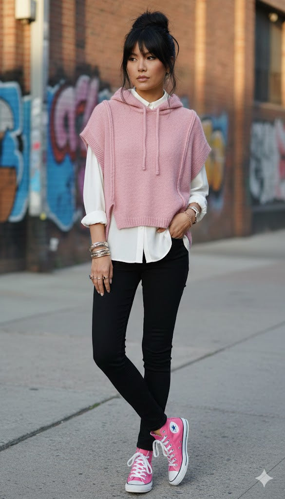 Ein modischer Kurzarm-Strickpulli mit Kapuze und Bindebändern, der durch seine weiche Materialmischung und den bequemen Schnitt überzeugt. Ideal für lässige Looks und vielseitig kombinierbar – ein Must-have für alle, die Stil und Komfort schätzen.