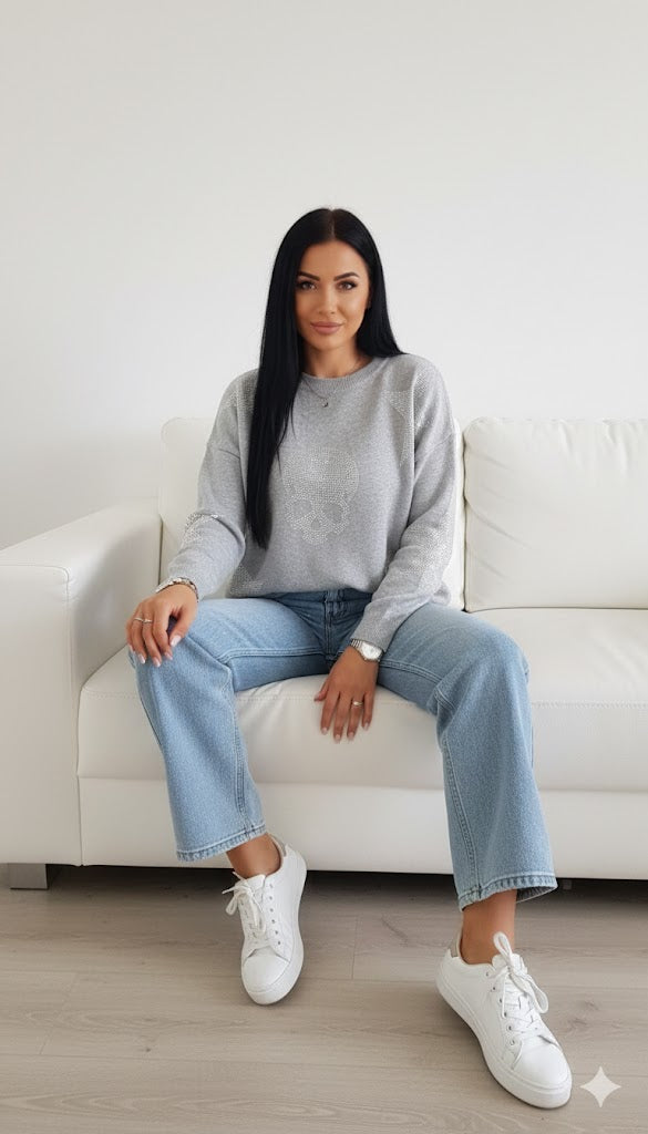 • Stil: Edler Feinstrickpulli mit funkelndem Totenkopf-Motiv.
