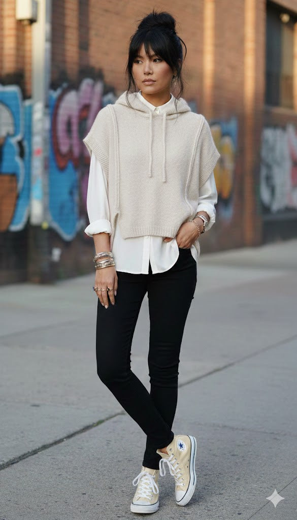 Ein modischer Kurzarm-Strickpulli mit Kapuze und Bindebändern, der durch seine weiche Materialmischung und den bequemen Schnitt überzeugt. Ideal für lässige Looks und vielseitig kombinierbar – ein Must-have für alle, die Stil und Komfort schätzen.